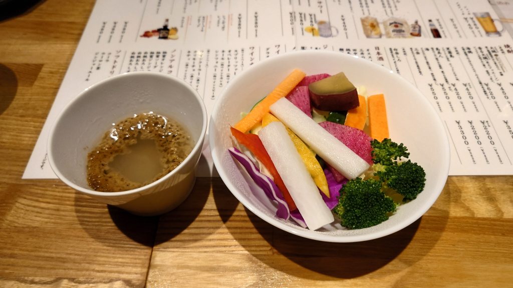 Ese día, tenía planeado ir a tomar algo con unos amigos que viven en Fukuoka después de jugar, así que fuimos a este restaurante. Haruyoshi, a un paseo de Nakasu, ¡y estaba muy bueno! Servían bagna cauda como aperitivo, ¡y podíamos pedir tantas raciones como quisiéramos! Creo que sólo por la bagna cauda merece la pena ir.