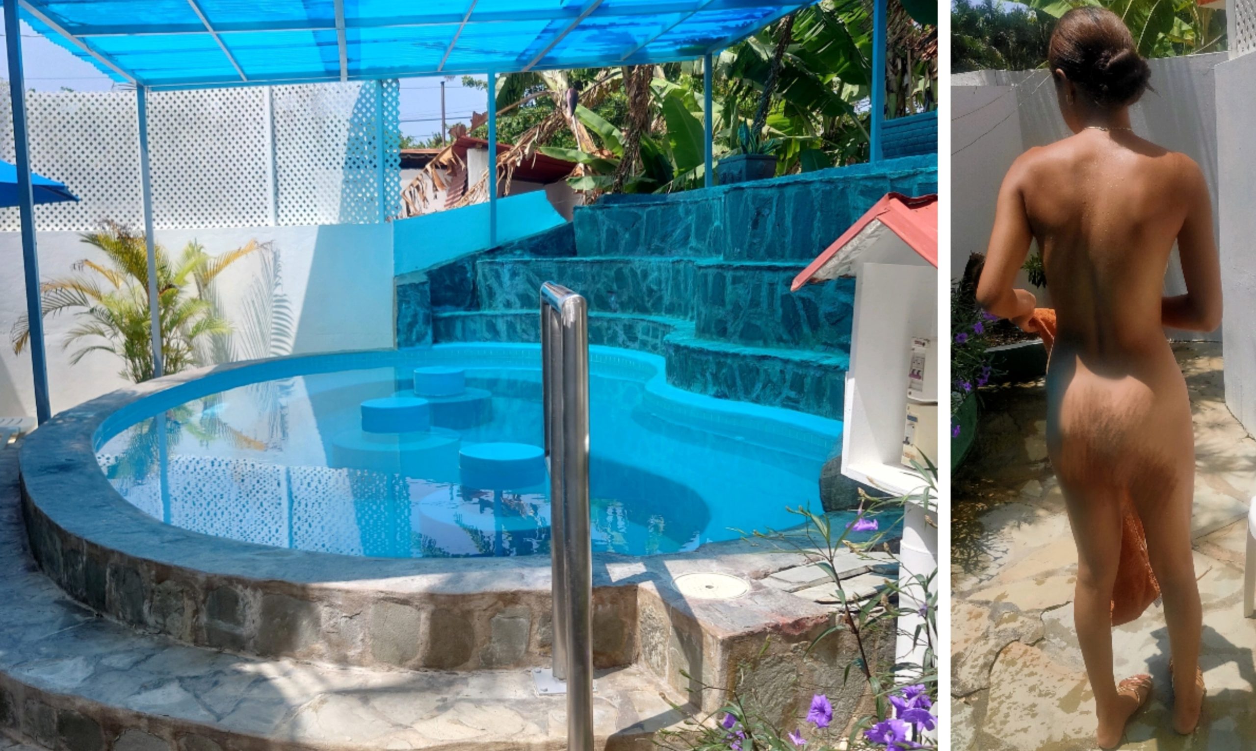 料金は3,000 DOP(約7,500円)でOK。ジャグジーに行くのもOKとのことだったので、交渉成立。部屋にバスタオルを取りに行き、Ashleeに再び声をかけると「先に行ってて」とAshlee。ジャグジーに行き、服を脱いで先に入ります。
